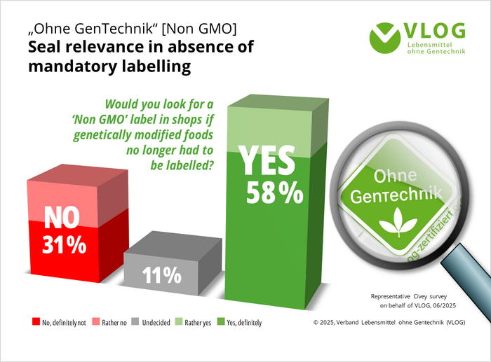 58 percent of consumers in Germany would pay attention to a "Ohne Gentechnik" (Non-GMO) seal when shopping if genetically modified foods no longer had to be labelled in future. This was the result of a representative survey commissioned by VLOG.