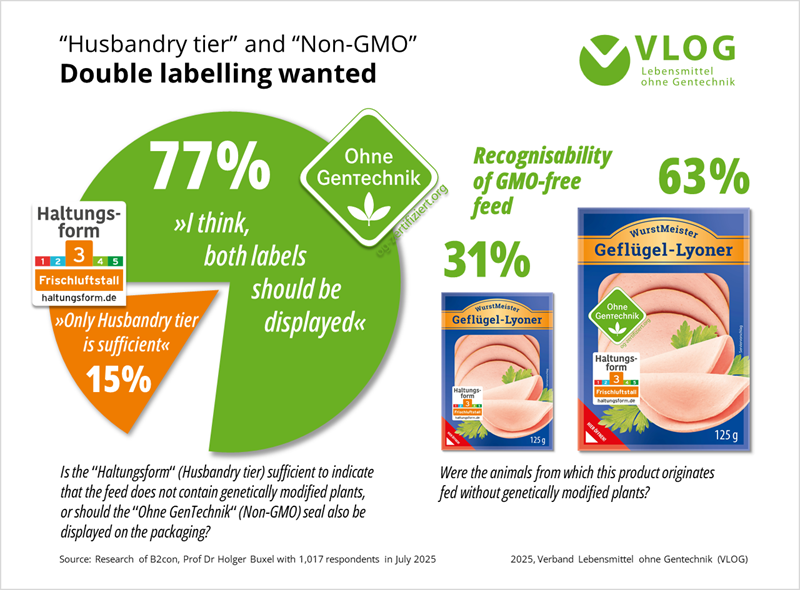 Prof Dr Holger Buxel from Münster University of Applied Sciences presented a comprehensive questionnaire to 1,017 people in a quota-based online survey in July 2025 on behalf of VLOG. According to the survey, 76 percent of respondents consider the "Ohne GenTechnik" seal to be useful, while 66 percent find it helpful in selecting the right products for themselves. 76 percent believe that products with GMO-free feed should be labelled with the "Ohne GenTechnik" seal.