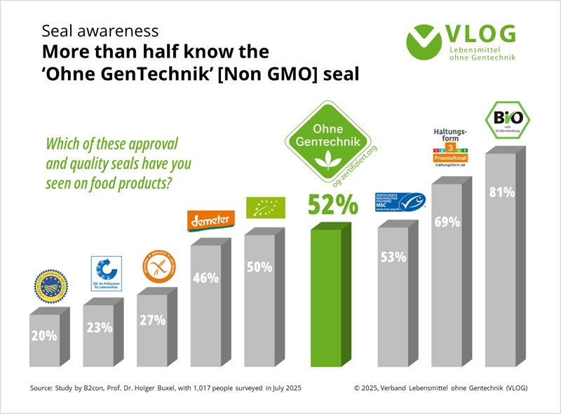 In July 2025, 52 percent of a total of 1,107 respondents stated in a comprehensive representative online survey conducted by Prof Dr Holger Buxel from Münster University of Applied Sciences on behalf of VLOG, that they had noticed the "Ohne GenTechnik" seal on food products before the survey.